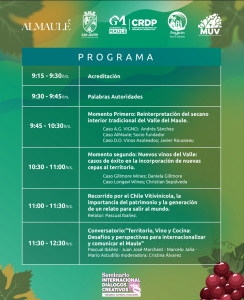 Entre los temas que abordarán los especialistas destacan la reinterpretación del secano interior del Valle del Maule, el surgimiento de nuevas cepas y vinos emergentes, la puesta en valor del patrimonio vitivinícola y su proyección al mundo, y el conversatorio “Territorio, Vino y Cocina: Desafíos y perspectivas para internacionalizar y comunicar el Maule”, instancia que reunirá a voces destacadas del enoturismo, la gastronomía y la comunicación.